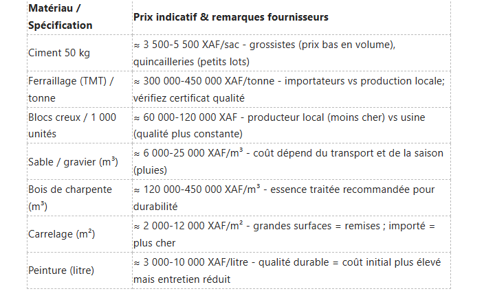 Vous devrez budgéter chaque poste matériaux en tenant compte de la variabilité régionale : le ciment 50 kg se négocie généralement autour de ≈ 3 500-5 500 XAF la sac, tandis que le ferraillage (TMT) peut osciller entre ≈ 300 000-450 000 XAF/tonne selon la qualité et la disponibilité. Pour les blocs creux, comptez environ ≈ 60 000-120 000 XAF pour 1 000 unités selon format et qualité ; le bois de charpente varie fortement (≈ 120 000-450 000 XAF/m³) en fonction de l’essence et du traitement.