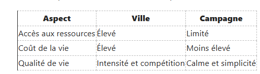 Cette comparaison souligne l'importance d'évaluer vos propres priorités et vos valeurs. Que vous cherchiez l’animation d’une ville vibrante ou la tranquillité de la campagne, vos expériences personnelles créeront un tableau unique de votre satisfaction de vie.