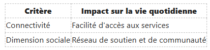 Les services disponibles constituent également un critère fondamental. Les grandes villes disposent d'infrastructures avancées comme des écoles, des établissements de santé et des options de loisirs, tandis que les zones rurales peuvent manquer de ces commodités. Toutefois, un sentiment de communauté plus fort et un environnement moins stressant sont souvent trouvés dans les petites localités, ce qui mérite réflexion.