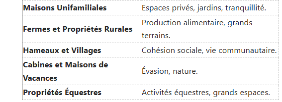 - Les habitations rurales sont souvent plus spacieuses et offrent un cadre naturel apaisant.