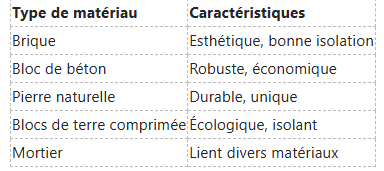 La maçonnerie est souvent privilégiée en raison de sa capacité à résister à des conditions climatiques variées et d'offrir une excellente isolation thermique. Vous constaterez que la longévité de ces murs dépend largement des matériaux utilisés et de la qualité de leur construction.