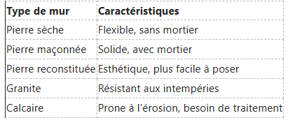 Une autre distinction importante concerne les matériaux utilisés. Vous pouvez rencontrer des murs en granite, en calcaire, ou en ardoise, chacun ayant ses propres exigences en matière de soin et de protection. Les murs en granite sont particulièrement résistants aux intempéries, tandis que ceux en calcaire peuvent nécessiter un traitement plus fréquent contre l'humidité. Reconnaître ces différents types vous aide à choisir les bonnes méthodes d'entretien.