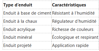 Il est crucial de choisir le bon type d’enduit en fonction de l’environnement et des besoins spécifiques de vos murs. Vous devez également considérer la durabilité, le coût et les propriétés d’isolation de chaque type. Vous trouverez ci-dessous un tableau récapitulatif des types d’enduits et de leurs caractéristiques :