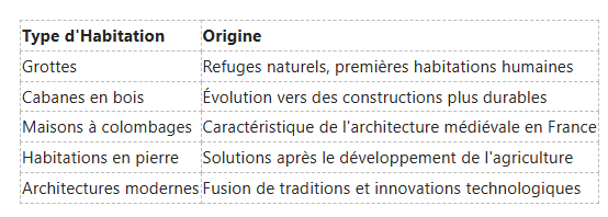 Avec le temps, les villages et les cabanes en bois ont vu le jour, souvent organisés autour de l'agriculture. Les techniques du bâtiment se sont perfectionnées, entraînant l'apparition de divers styles, comme les maisons à colombages en Alsace ou les bâtiments en pierre dans le sud de la France. Pour le comprendre, regardez ce tableau qui résume quelques origines :