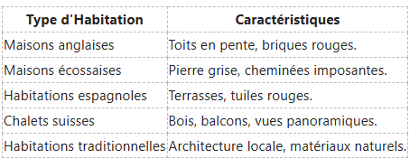 - Les habitudes culturelles, comme la vie en communauté, influencent également le choix des logements dans différents pays.