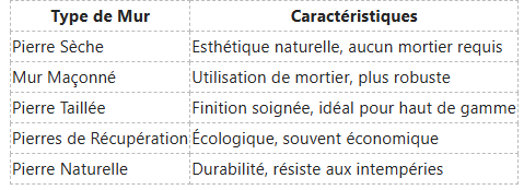 Les murs en pierres taillées, quant à eux, sont souvent utilisés dans des constructions haut de gamme en raison de leur esthétique et de leur durabilité. Vous devez considérer l'emplacement et le style architectural de votre projet pour choisir le type le plus adapté. Voici un tableau avec les différents types de murs en pierre :