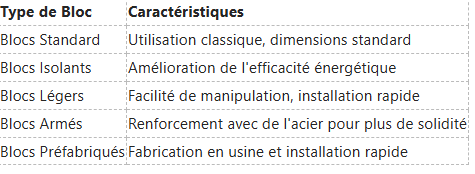 Les blocs de béton armé sont renforcés avec de l'acier pour plus de solidité, tandis que les blocs de béton fendu permettent de créer des finitions esthétiques. Vous pourriez également envisager des blocs de béton préfabriqués pour des projets plus rapides. Ce choix de type de bloc peut influencer l'ensemble de votre projet, notamment en matière de coût et de performance.