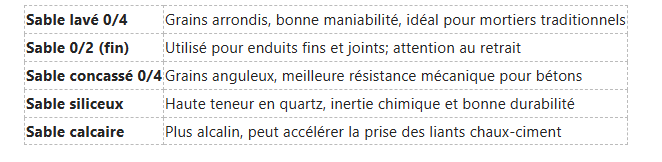 Si vous incorporez des additifs (plastifiants, hydrofuges), testez des petits lots : certains adjuvants interagissent différemment selon la nature du sable (siliceux vs calcaire). De plus, contrôlez la teneur en sel soluble par un essai simple (lavage et test conductivité) sur les sables de carrière côtière pour prévenir l’efflorescence sur les façades.