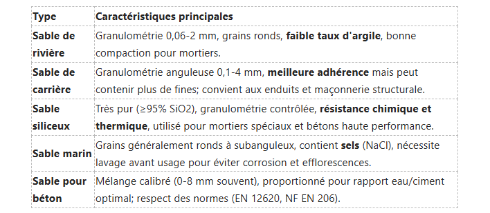 Si vous assemblez des éléments de maçonnerie non portante, le sable de rivière est souvent recommandé; toutefois, soyez vigilant aux dépôts organiques ou limons contenus localement et exigez un lavage si le taux de fines dépasse 8-10 %.