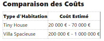 Analysez également l'évolution des coûts de la vie dans votre région. Une villa, bien que coûteuse à l'achat, peut présenter un meilleur retour sur investissement si la valeur immobilière augmente. À l'inverse, une tiny house a une charge financière initiale plus faible et des frais d'entretien réduits.