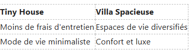 Cette comparaison révèle que votre choix dépend largement de votre style de vie souhaité et de vos priorités personnelles. Les Tiny Houses peuvent convenir à ceux qui recherchent la simplicité et la réduction des coûts, tandis que les villas spacieuses s'adressent à ceux qui privilégient l’espace et le confort. Vos valeurs et vos besoins détermineront en fin de compte la meilleure option pour vous.